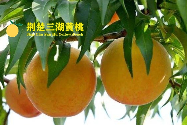 标志明显包括“绿叶、鲜黄卡通黄桃”+“荆楚三湖黄桃Jing Chu San Hu Yellow Peach”的标志